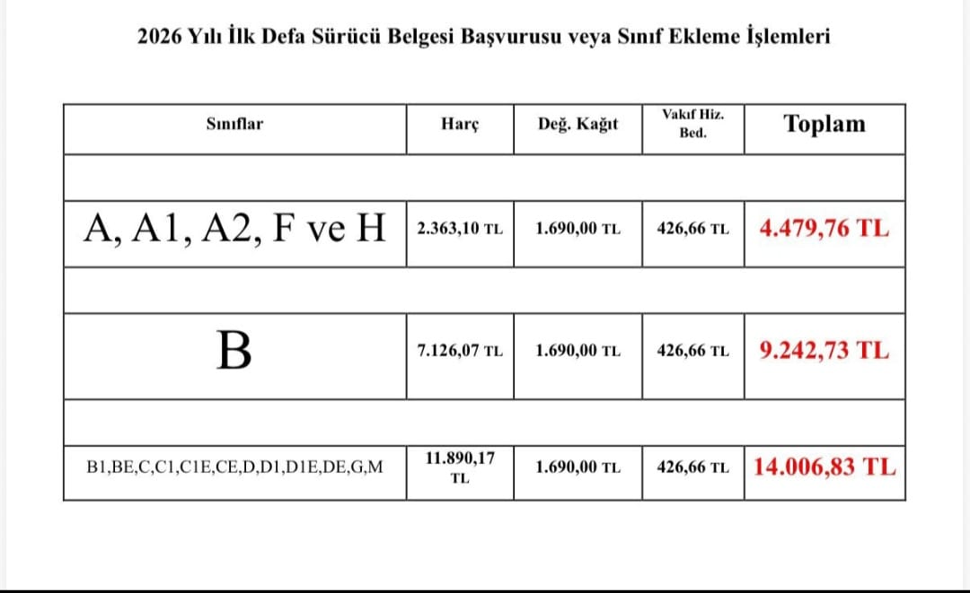 2026 YILI SÜRÜCÜ BELGESİ SINIFLARI MALİYE HARCI + KART VE VAKIF BEDELLERİ TOPLAMI